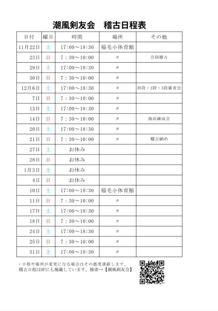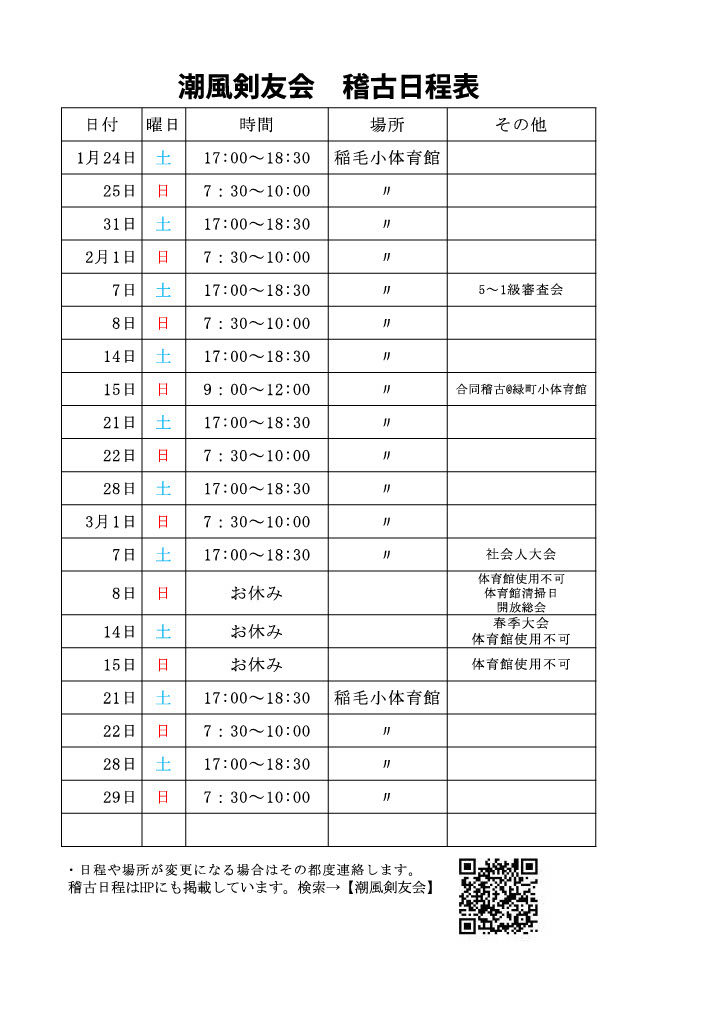 (9月22日更新)10月26日(日)の稽古については決まり次第お知らせします